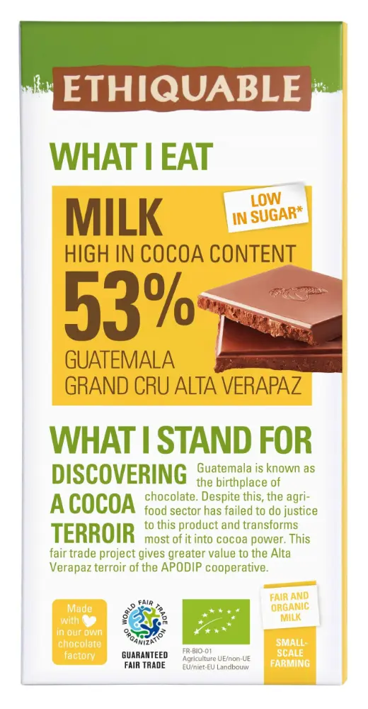 Guatemala 53% Grand Cru Alta Verapaz melkchocolade, geproduceerd in een zeer donkere chocoladesmaak, verrast met zijn intensiteit en complexiteit van aroma’s, maar niet zonder elegantie. Deze chcolade combineert een vleug zeer donkere karamel met een krachtige melkachtige smaak en, onverwacht, nuances van gebrande koffie en gedroogd fruit.