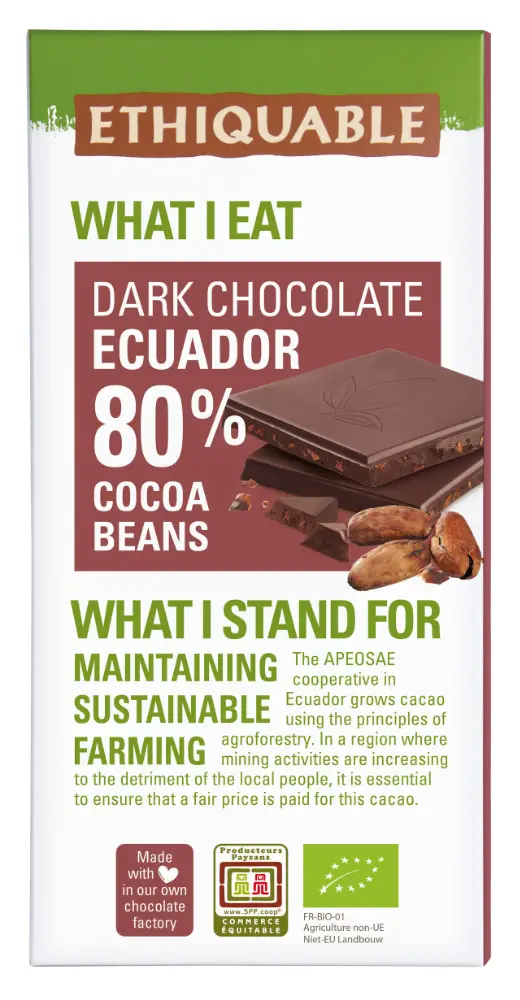 De cacao in deze chocoladereep is ook afkomstig van vijf andere fairtradeprojecten met de Ecuadoraanse producentencoöperaties FONMSOEAM, UOPROCAE, UNOCACE, FAPECAFES en UROCAL.