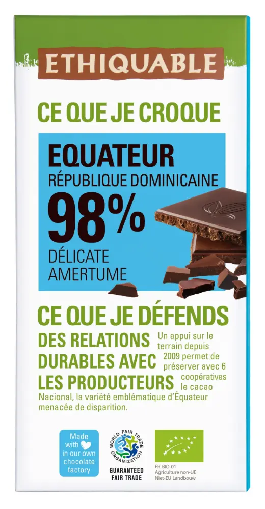Deze tablet pure chocolade 98% biedt alle kracht van bijna pure cacao, omdat hij geen cacaoboter bevat. Toch blijft de chocolade 98% zeer aromatisch. Dit recept behoudt de fijne bitterheid en is zeer aromatisch dankzij de bloemige smaak die typisch is voor de cacao nacional uit Ecuador. Deze hoge concentratie zorgt ervoor dat het bekend staat als een natuurlijke eetlustremmer en krachtige antioxidant.