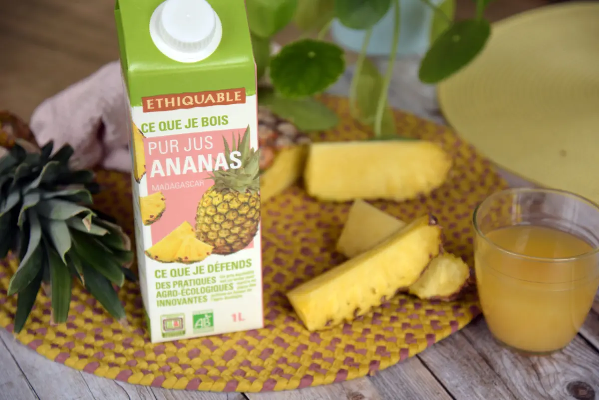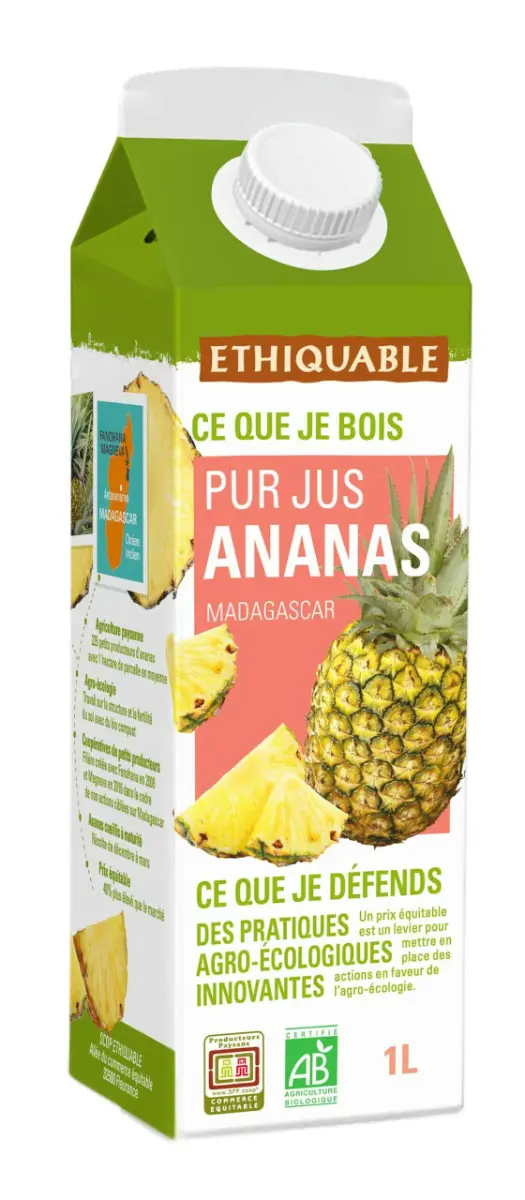 In dit pure fairtrade en biologisch sap kan u de Victoria- en Cayenne-ananassen proeven van de producenten van 2 coöperaties in Madagaskar.