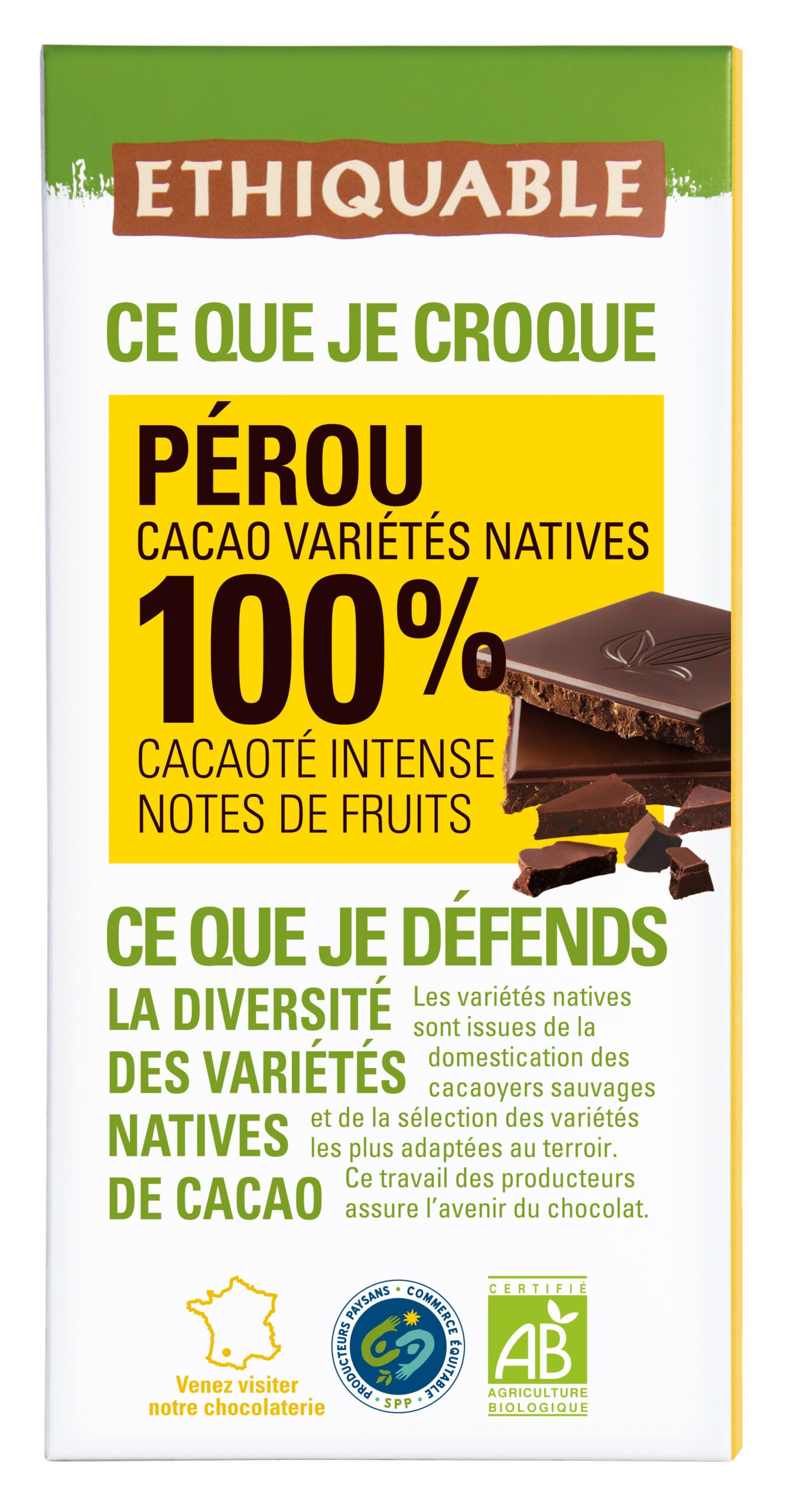 Découvrez l’intensité pure du chocolat noir 100% cacao élaboré à partir de variétés natives de cacao du Pérou. Un grand cru d’exception pour les amateurs de chocolat corsé, sans sucre ajouté, aux arômes d’une richesse surprenante.