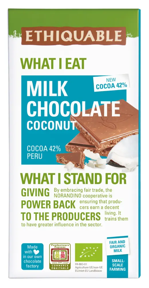 Cette tablette au goût simple et évident, reste intense et profonde avec 42 % de cacao, une teneur plus élevée que dans la plupart des tablettes de chocolat au lait classiques, et une sucrosité subtile : le sucre ne vient pas gâcher la fête, laissant pleinement s’exprimer les saveurs naturelles de la noix de coco et du cacao.