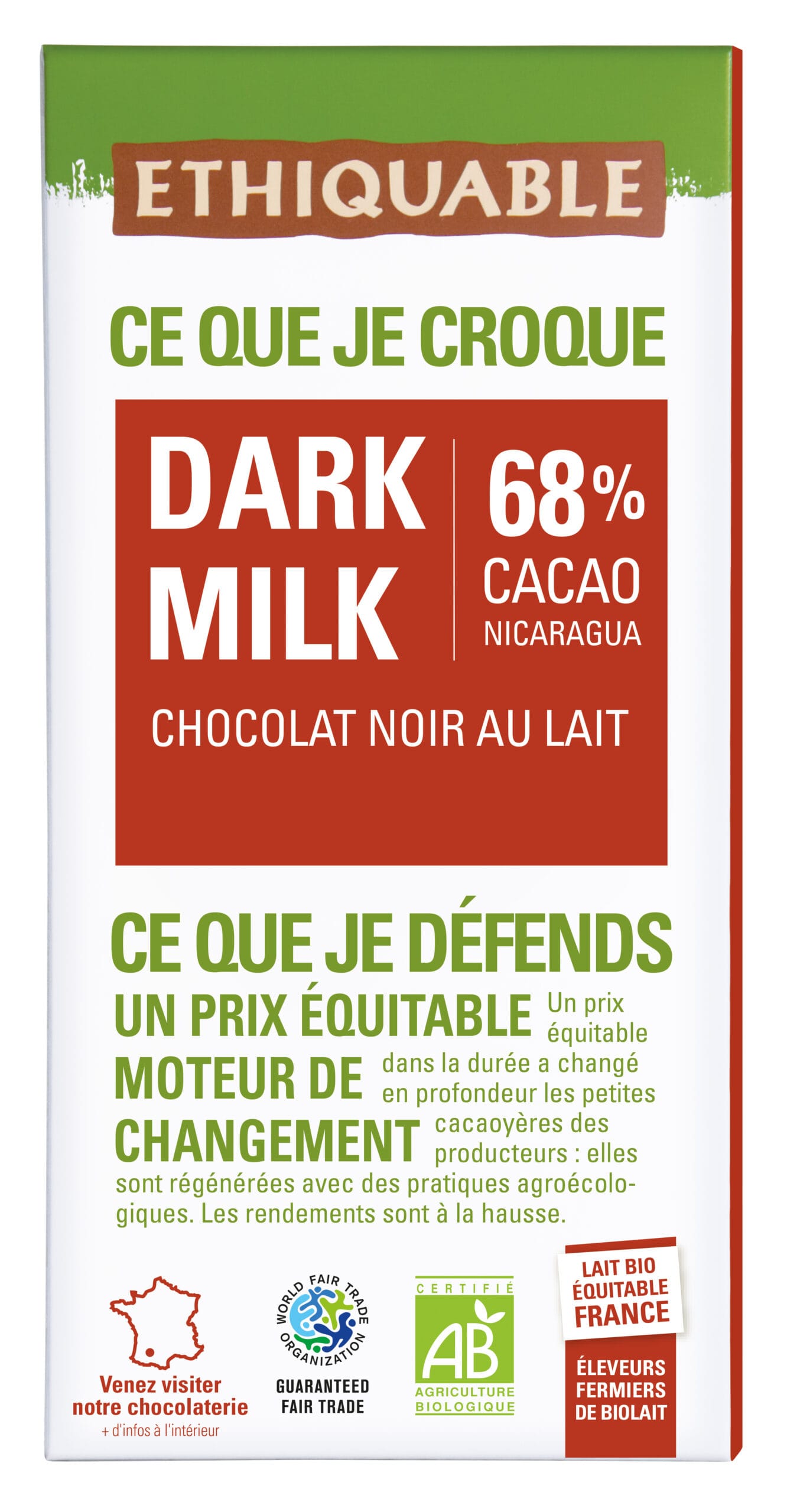Plus rond qu’un chocolat noir classique, ce chocolat dark milk 68% met en valeur la richesse aromatique d’un cacao bio issu du Nicaragua, subtilement adouci par une touche lactée. Une texture soyeuse, une profondeur authentique — pour les palais en quête de force avec subtilité.