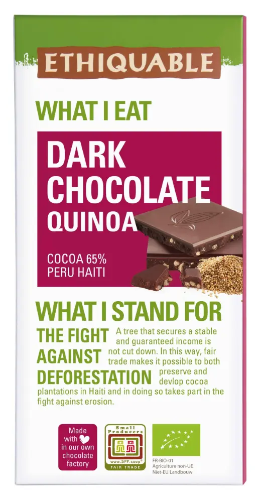 Le cacao de cette tablette provient de la coopérative FECCANO (Haïti) et également de huit autres projets de commerce équitable avec des coopératives de producteurs au Nicaragua et au Pérou.