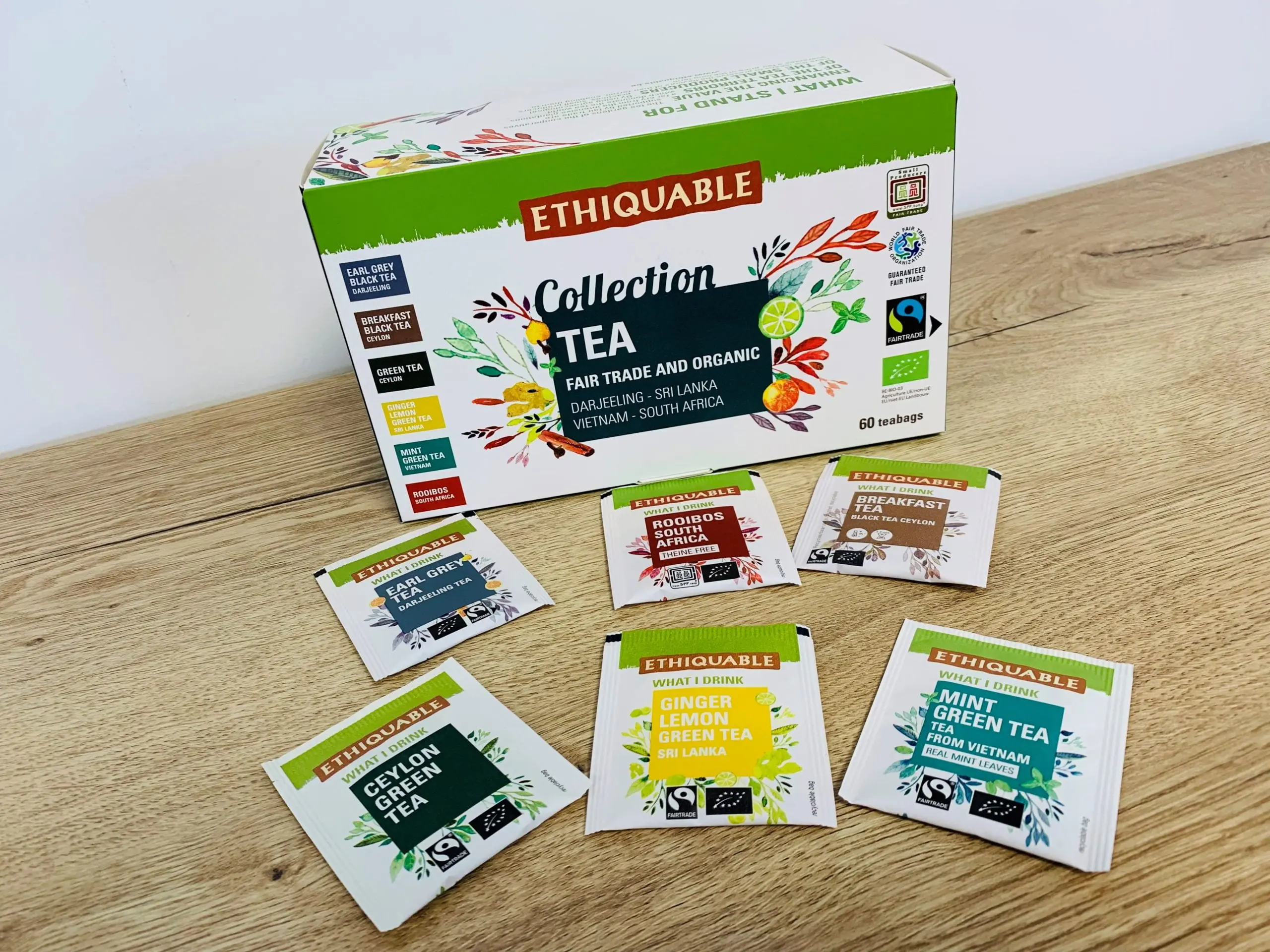 10 sachets de 6 recettes : THÉ VERT • THÉ VERT MENTHE • THÉ VERT GINGEMBRE CITRON VERT • THÉ EARL GREY • THÉ TCHAÏ AUX ÉPICES • ROOIBOS