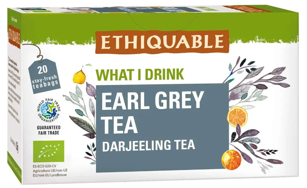 Un thé noir Earl Grey pur Darjeeling équitable et bio finement parfumé à la bergamote et aux écorces d’orange.