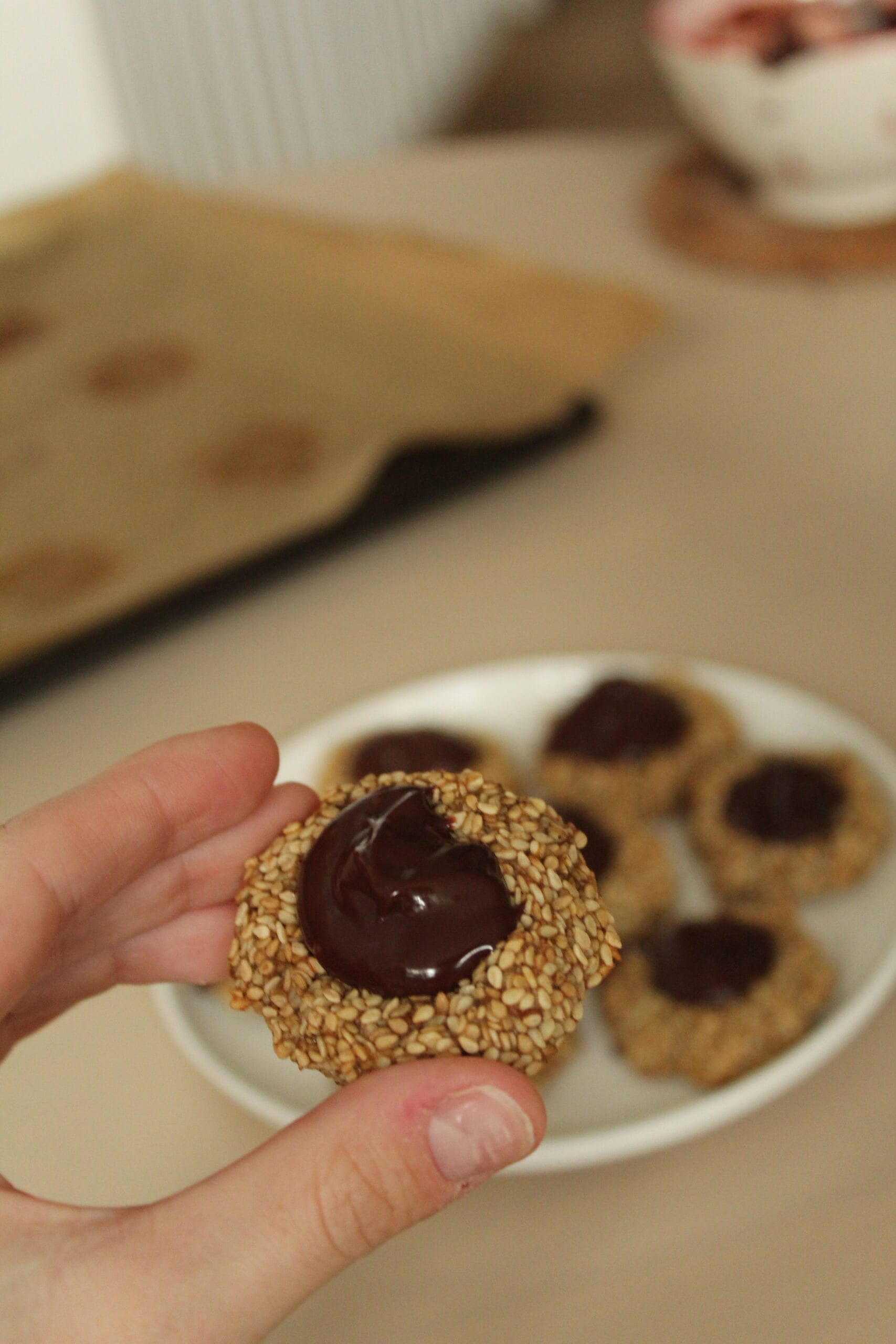 Des biscuits sésame choco fondants et croustillants, au cœur de ganache chocolatée et une touche de fleur de sel.